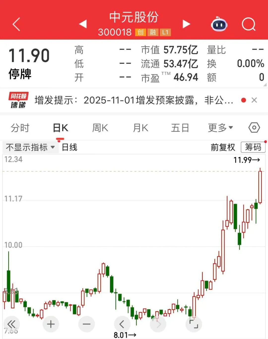 公司股票自10月27日开市起停牌。数据显示,截至10月24日收盘,中元股份股价报11.9元/股,收盘涨幅为8.58%,市值为57.75亿元。